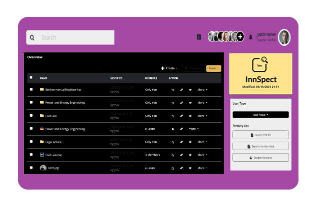 InnSpect Making work life better, keeping all files in sync. It will transforms the way people working and will reduce complexity. So, you can just focus on building your application. The prebuilt template for File storage, File transfer, File requests, File deleted and Recent File pages will reduce all the design hustle and save huge time of creating concepts.